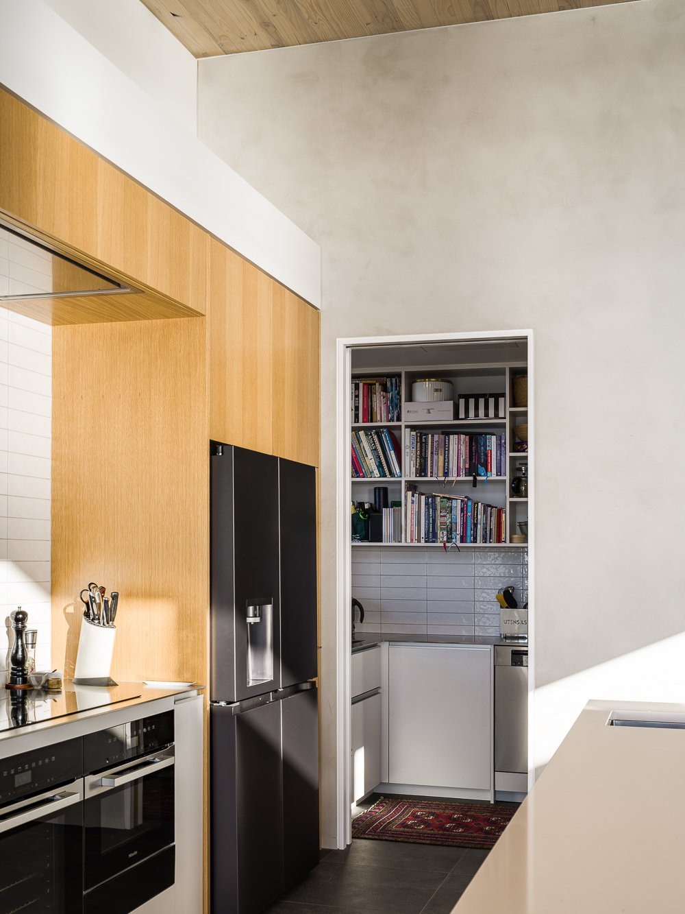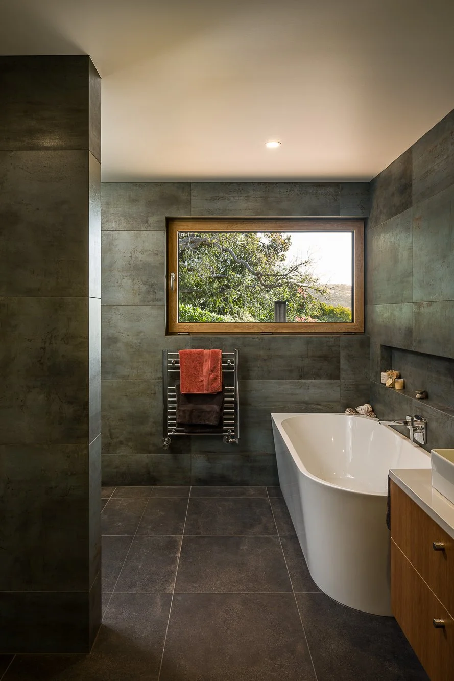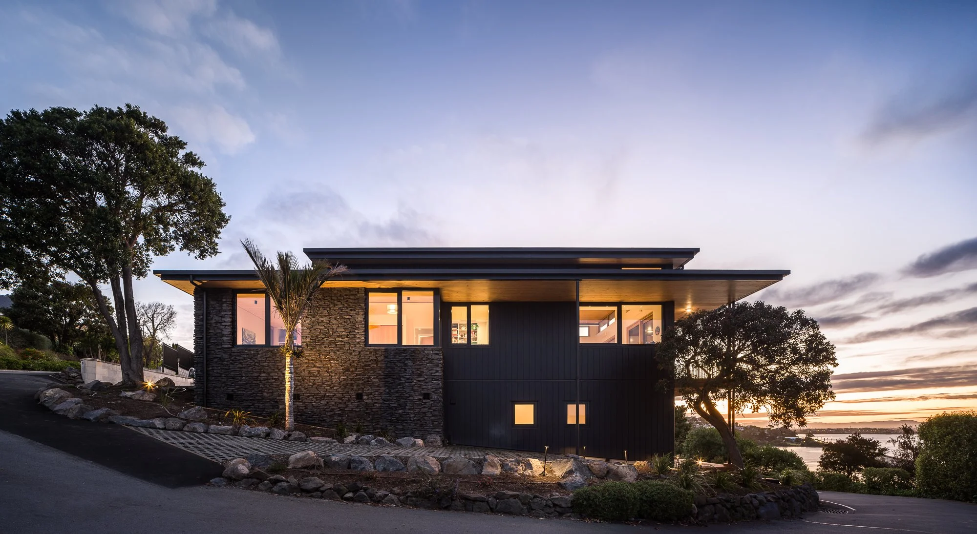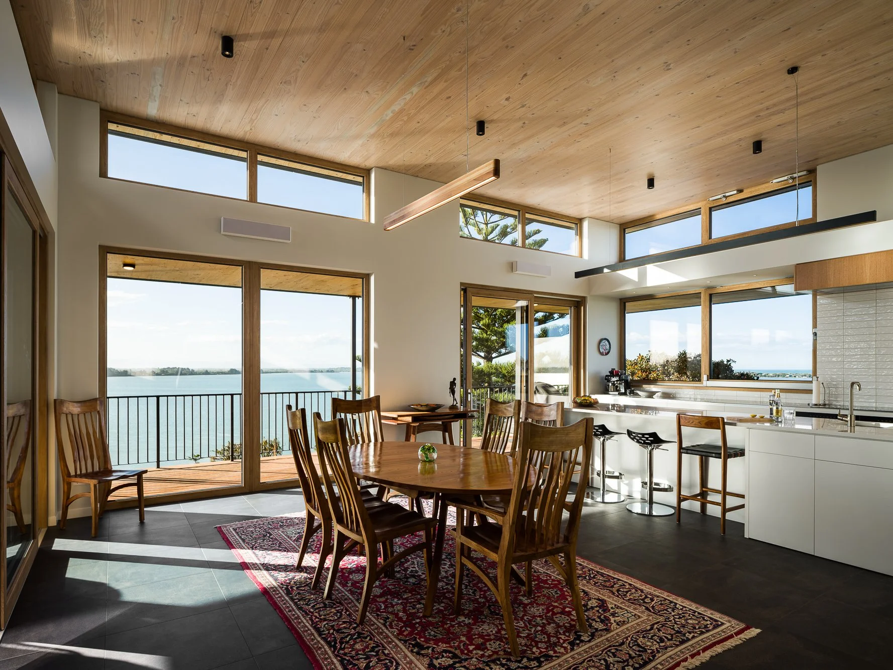 Studying the site’s former house before its demolition allowed the new home’s design to improve and perfect upon its predecessor, confirming how best to integrate into the site and surrounding environment. Expansive windows highlight the stunning views with exceptional thermal performance, using high-performing uPVC, triple-glazed European joinery with an R-value of about the same as a code minimum 90mm wall. In summer, the windows are protected by large eaves and vertical external blinds to prevent overheating, yet sheltered clerestory windows in the split roofs still allow quality morning light to enter deep into the home and gently diffuse throughout, illuminating the artwork gallery. Upon completion, the home's airtight construction achieved a great result of 0.56 ACH during the blower door test.